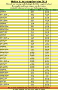 Hallen- und Anlagenpflegeplan 2024Dieser Eintrag wurde unter ohne Kategorie am 2. April 2024 Der aktuelle Plan zur Hallen- und Anlagenpflege.