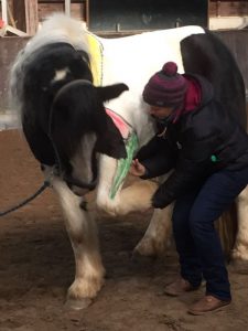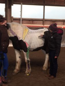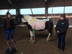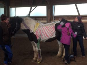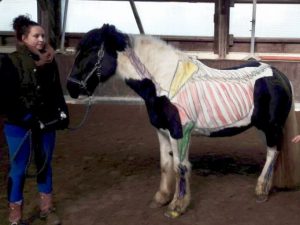 Unser neues Schulpferd Jackson diente als Anschauungsmodell und hat sich sehr brav und geduldig zur Verfügung gestellt. Zusammen mit den Kindern und Jugendlichen hat Britta ihn mit speziellen Farben bemalt, um die Lage der nochen, Bänder und Muskeln zu zeigen.